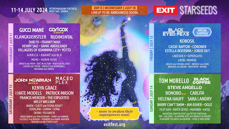 The next edition of the EXIT Festival, carrying an EXIT Starseeds theme and the slogan “Awakening Our Superpowers Together,“ will take place from July 10 to 14, 2024, at the Petrovaradin Fortress. A special Starseeds Takeover performance on the Tesla Universe stage is reserved for day zero. Four-day tickets are available on the festival’s official website.