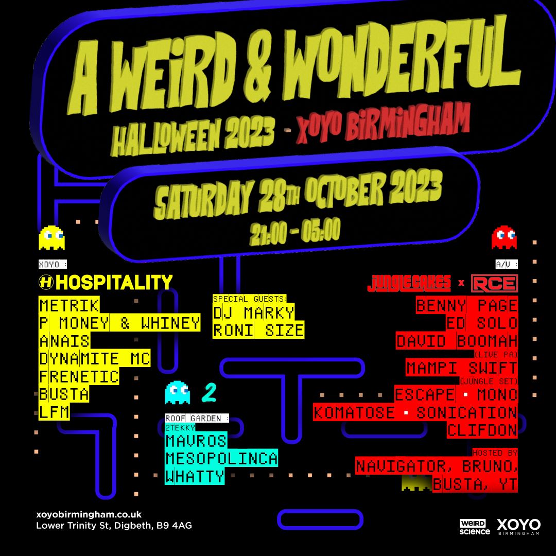 On Saturday 28th October, the scare factor is notched up to 100 for A Weird & Wonderful Halloween Special as it brings a spooky venue makeover and scare actors who’ll roam the dancefloors. This takeover sees heavyweight drum ‘n’ bass brands Hospitality Records and Jungle Cakes bring a wave of the genre’s biggest names to Birmingham, including Metrik, P Money & Whiney, Anaïs, Dynamite MC, DJ Marky, Roni Size, Benny Page, Ed Solo, Mampi Swift and more. Local UKG brand 2tekky will also take over the Roof Garden, accompanied by Mavros, Mesopolonica and Whatty.